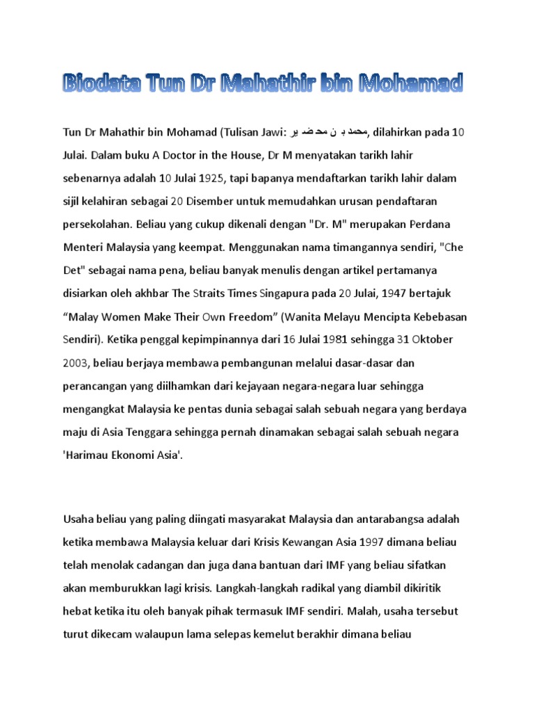 Biodata Ringkas Tun Dr Mahathir Pdf